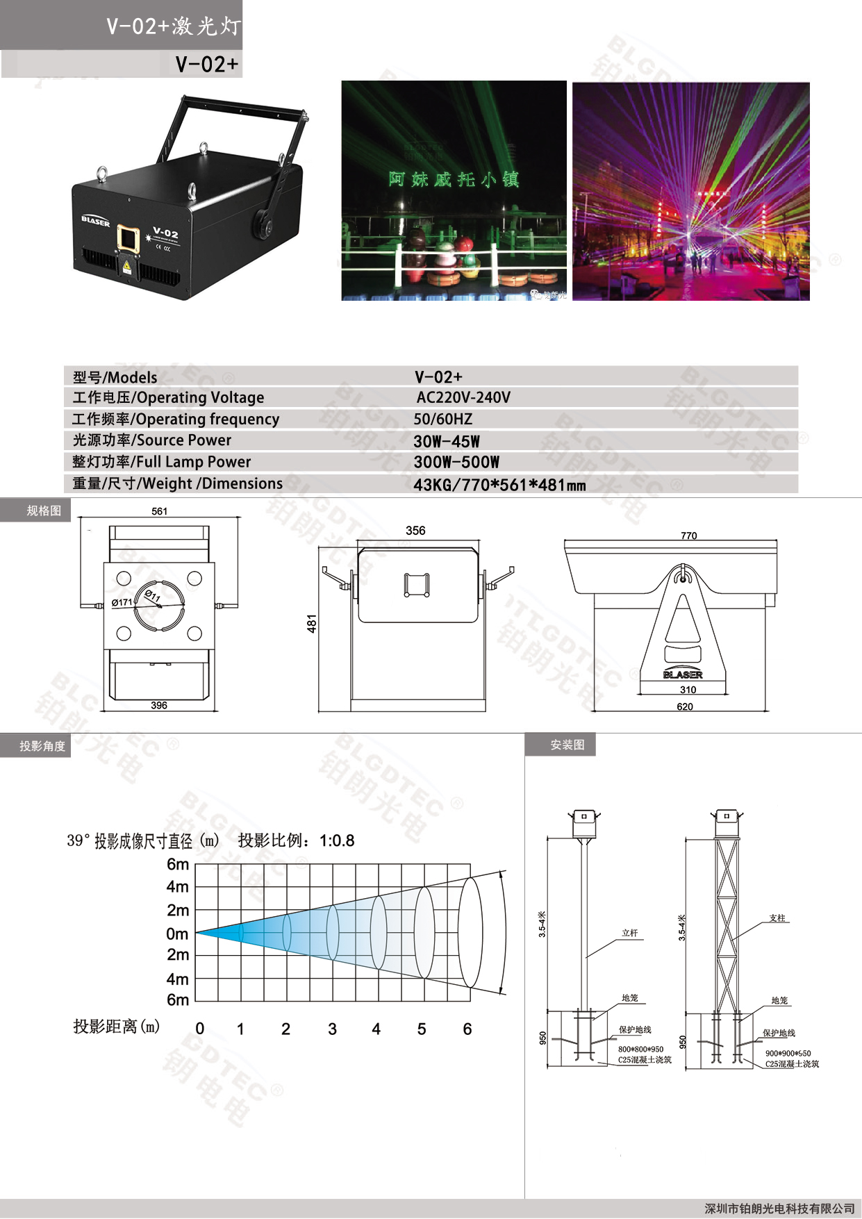 V-02+激光灯外壳为航空铝型材一体成型具有散热好,安装方便,稳定性高,具备防尘、防潮功能,采用IP65防护等级,适用于户外夜游灯光、北极光、水秀、激光秀。