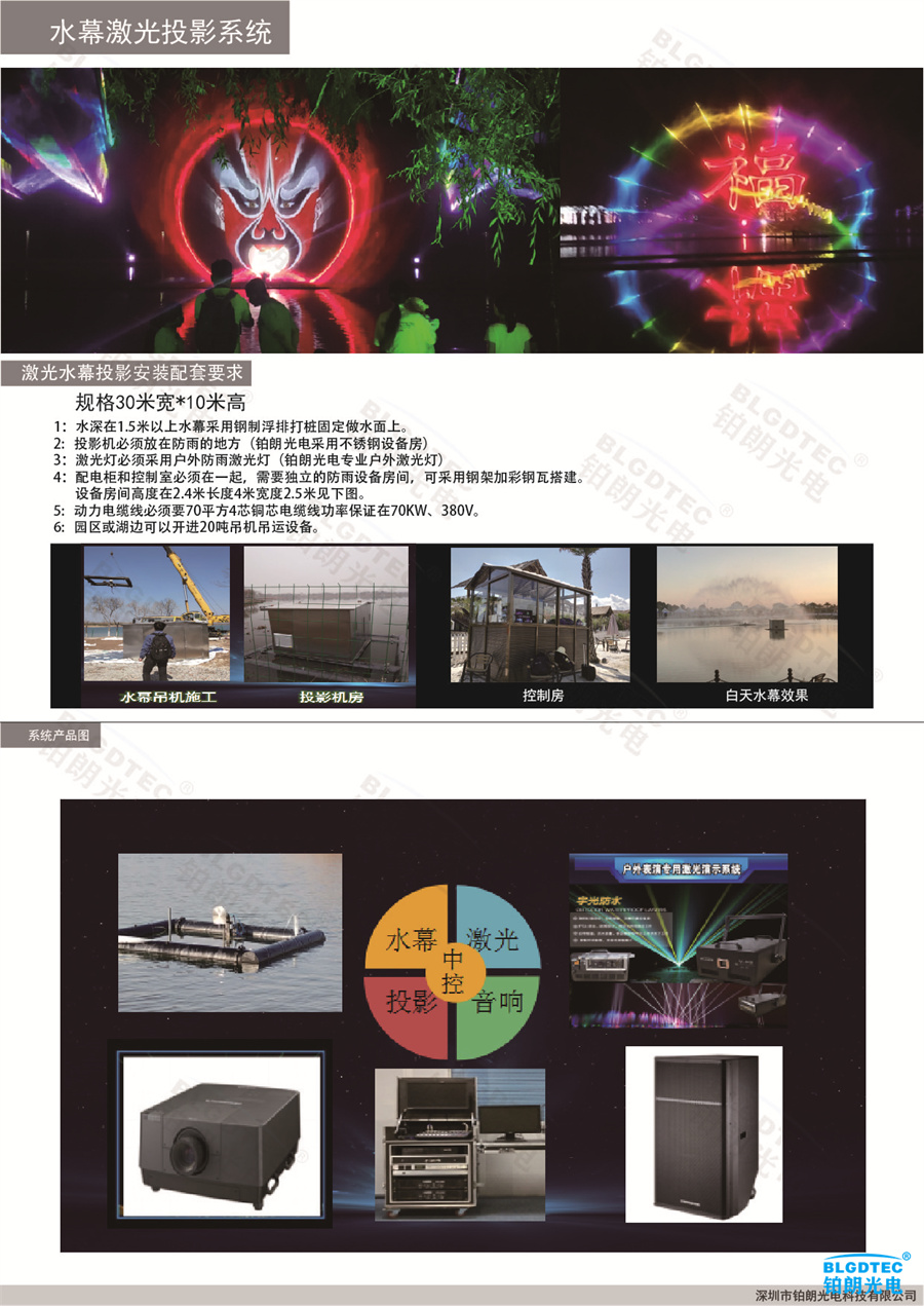 激光水幕电影由激光演示系统,激光投影系统、水幕发生器、音响系统组成,比银幕 电影要好看。它摒弃常用的白布、墙面,改
