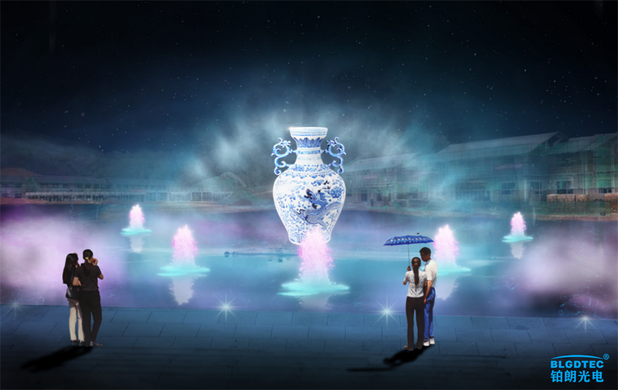用水幕作为投影载体,通过高压水泵和 水幕发生器将水高速喷出,雾化后形成“银幕”,再由专用放映机将影像投射出来。由于