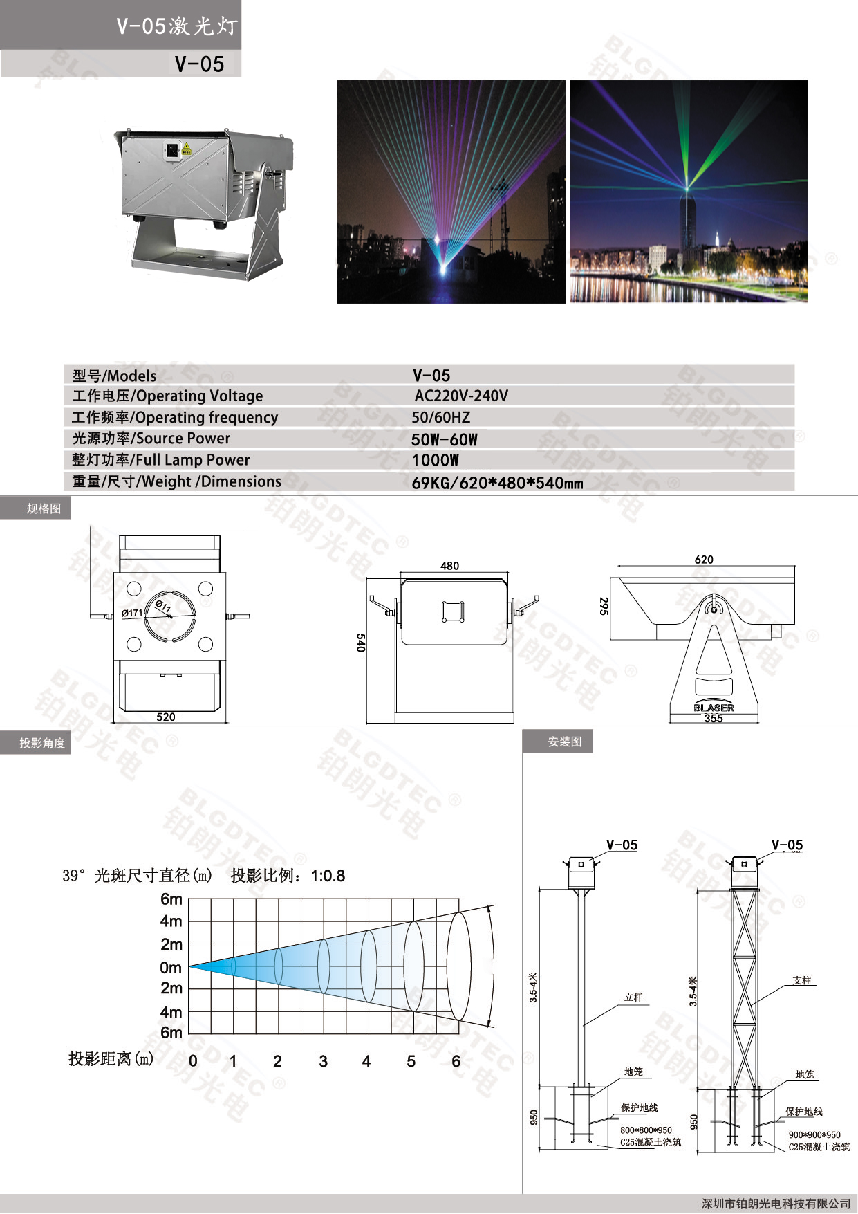 V-05激光灯外壳为铝型材成型具有散热好,方便安装,稳定性高,具备防尘、防潮功能,采用IP65防护等级,适用于户外亮化灯光、时空隧道、北极光、光影水秀、激光秀。